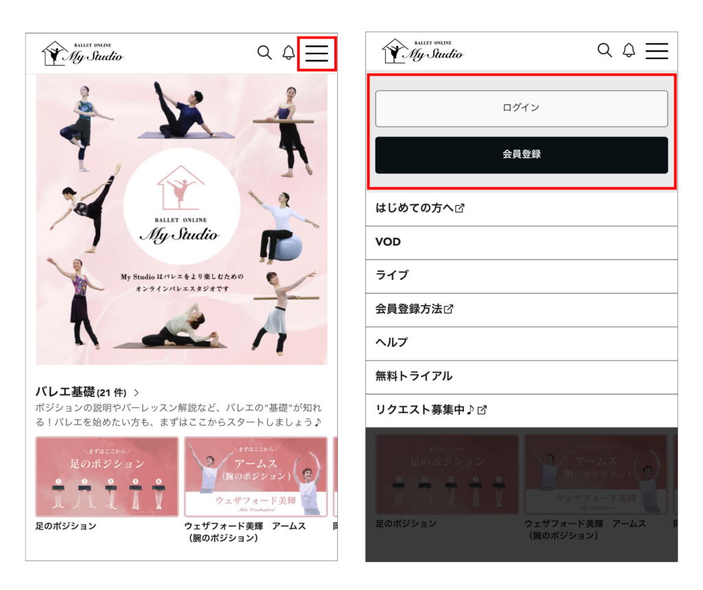 1. My Studioサイトにて、右上のメニュータブから「会員登録」をお願いします。