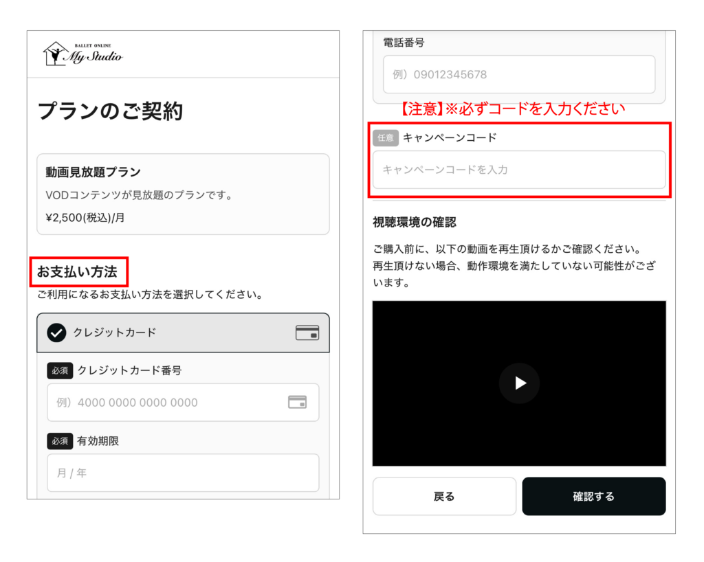 3.お支払い情報を登録後、同じページ下部にあるキャンペーンコード(確定メールに記載あり)をご入力ください。