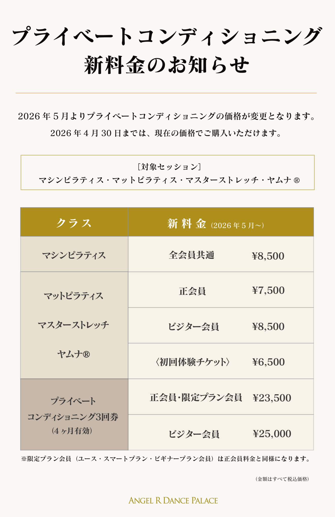 表参道校A・Bルームにて開講しておりますプライベートコンディショニングクラスの新料金に関するお知らせです。
